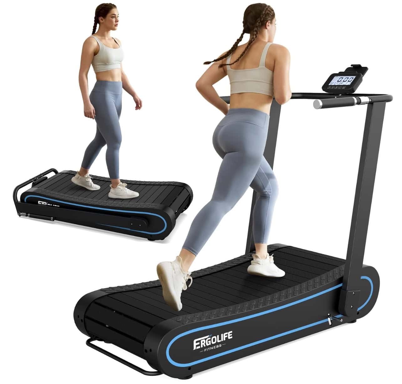 - Manual curved treadmill: Self-powered; speed controlled by your stride (no motor or electricity)