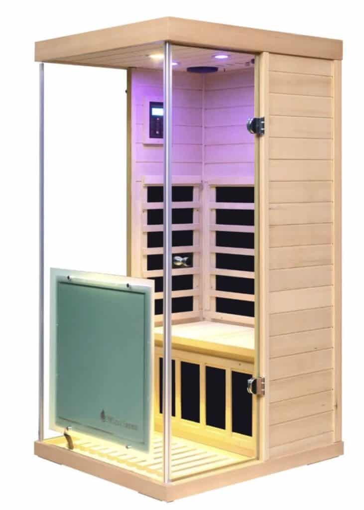 Their saunas use low-EMF carbon infrared panels and include extras like red light therapy, chromotherapy lighting, and Bluetooth connectivity.